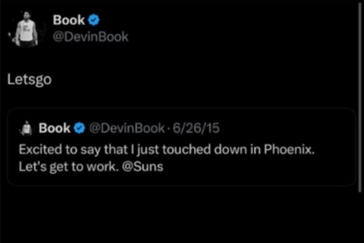 布克本人转发了自己在2015年13顺位被太阳选中,落地菲尼克斯后的推文:“很兴奋地宣布我落地菲尼克斯了,准备开干@太阳队”并配文写道:“再次开干!”