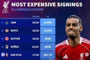 体育资讯9月2日讯 利物浦压哨签下今夏标王伊萨克,《转会市场》也统计了红军队史最贵买人情况,前三均为今夏新援。