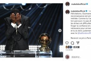 马克莱莱社媒:祝贺登贝莱,挫折与挑战铸就了你登上顶峰的决心